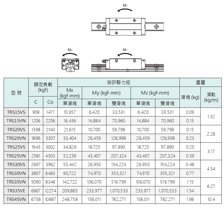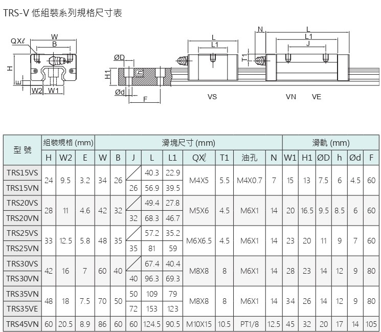 TRS-V系列具有高順暢性、高穩定性、高耐用性及高便利性,不僅鋼珠的運行軌跡更為順暢,提升滑軌組整體的順暢性,滑塊的穩定性也因使用可增加材料厚度的特殊專利設計,增強零配件的強度,減低滑座變形的可能性,且特殊接點設計除了具有高剛性之外,也具備自動調整之能力,使滑塊各個方向的受力平均,進而大幅提升滑軌組的精度與壽命,滑軌組奘配組裝容易,使用者可以輕鬆的上手。TRS-V低組裝的設計使其更加適合在空間較小的運行環境下使用。
